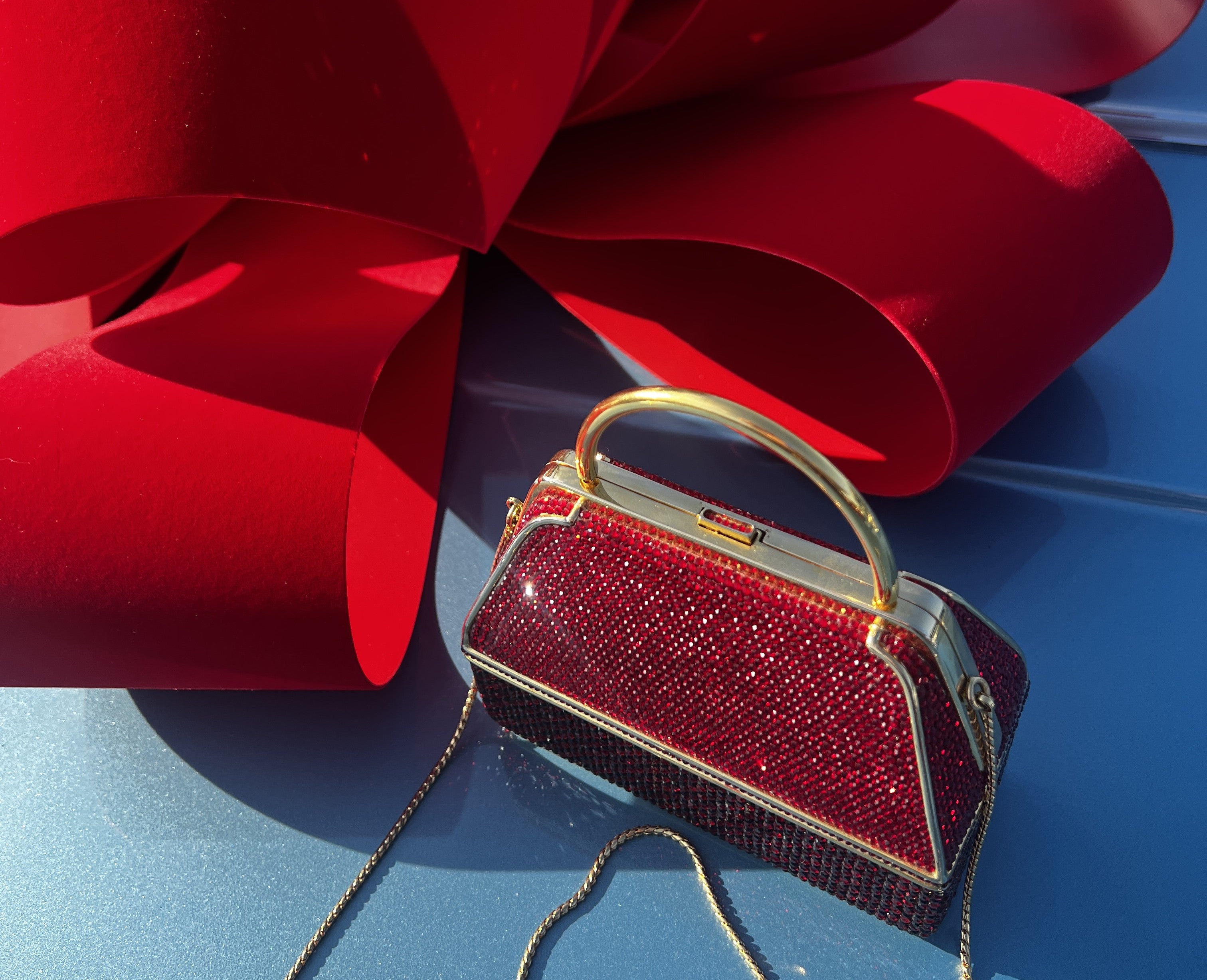 Judith Leiber Crystal Minaudiere Red, Black & Gold